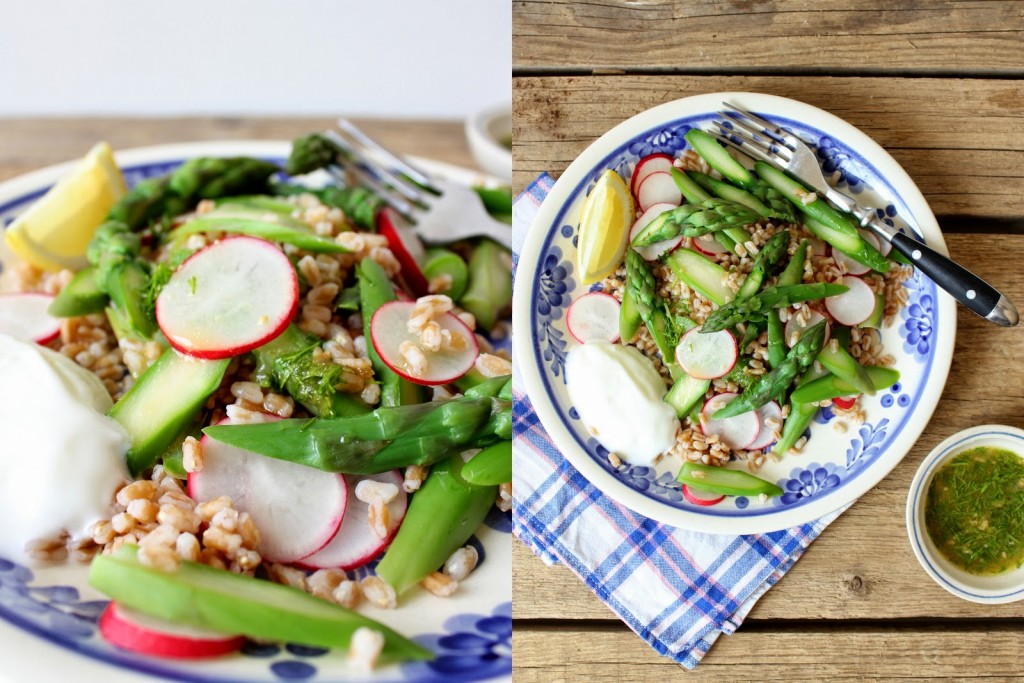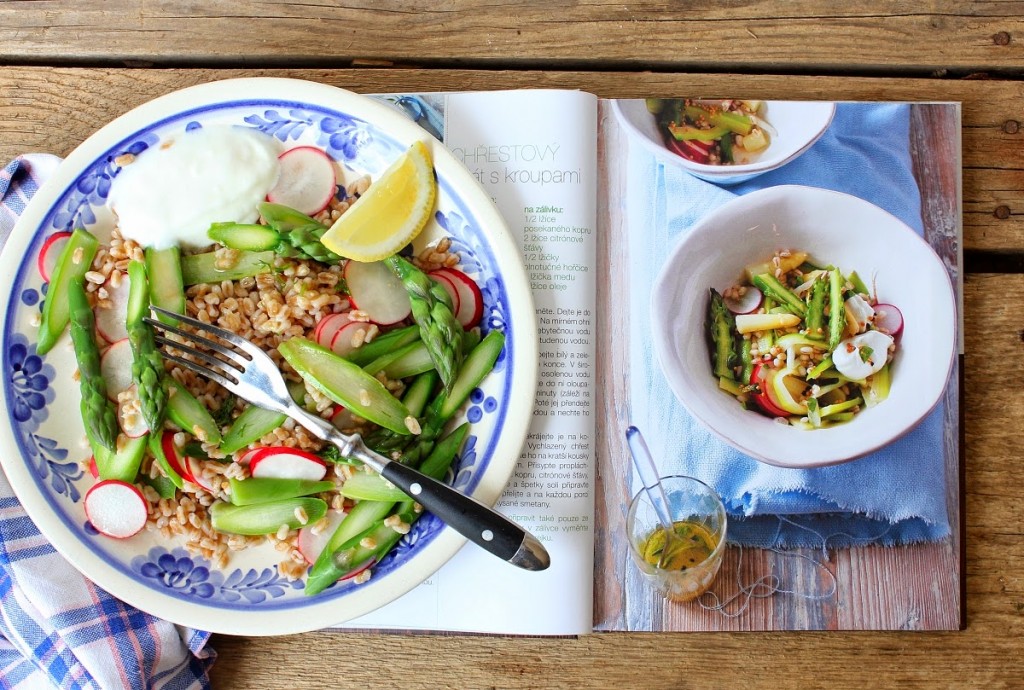 Přestože nám stejně jako všem ostatním doma nechybí exotické koření, káva z Brazílie, řecký olivový olej, španělské šunky či italské těstoviny, uvařit si občas jídlo z našich luhů a hájů nikomu neuškodí. Z receptů v kuchařce, které jsou sestavené podle sezóny nás zaujal jarní chřestový salát s kroupami a to hned ze dvou důvodů. Chřest je symbolem jara a v obchodech ten český najdete nyní snad opravdu všude. Za druhé skoro vůbec nevaříme s kroupami, a tak jsme tuhle klasiku chtěli vyzkoušet. Výborný salát se skvělým dresingem je pak ideální lehký oběd.